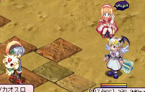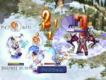 これ、kikiはアイスミサイル、りんごさんは乱打、ぽーさんは木刀(?)で戦ってます